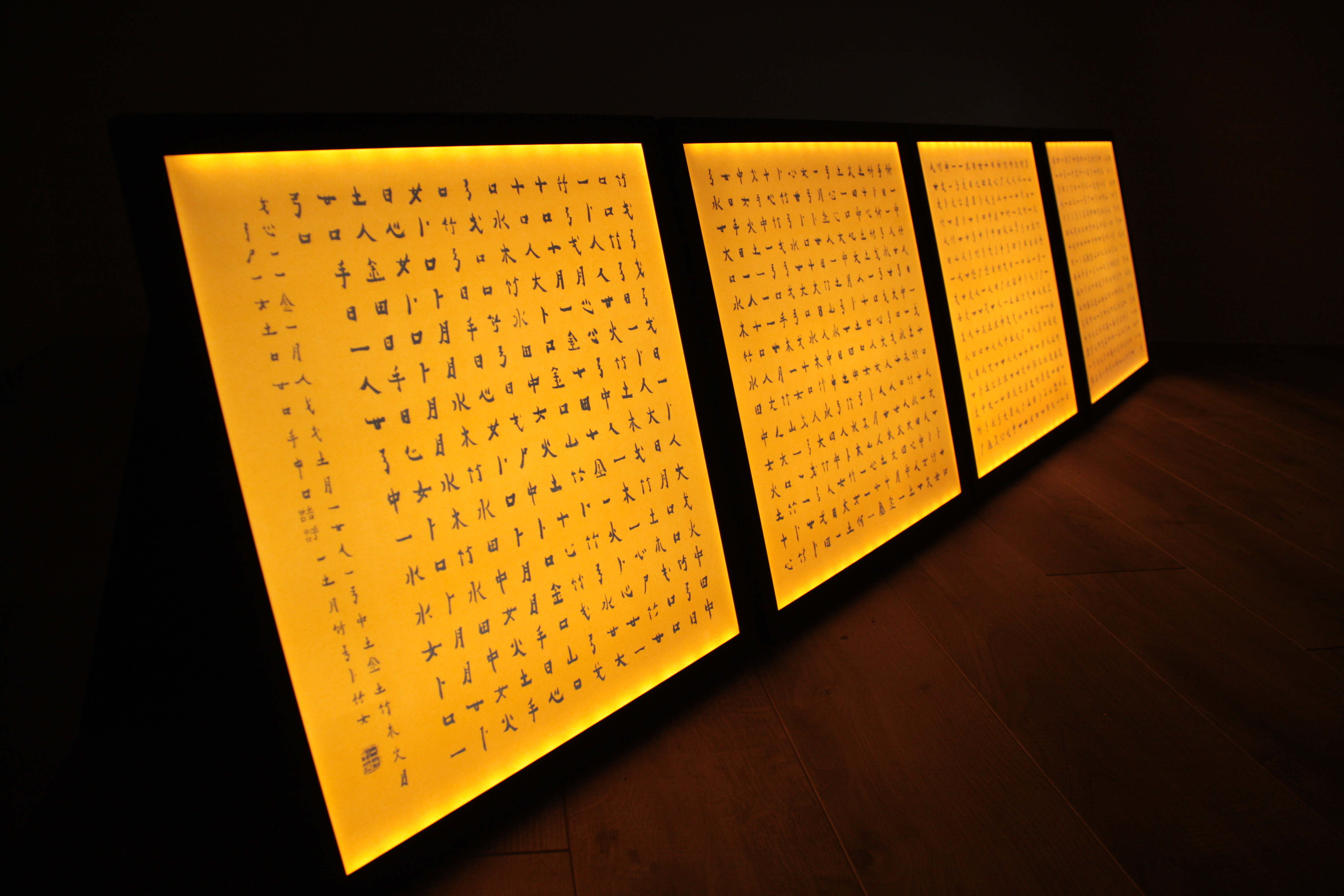 The work uses Chinese Cangjie typin method to disassemble the text of the Heart Sutra ; four led light-emitting panel are installed on the floor of the exhibition.